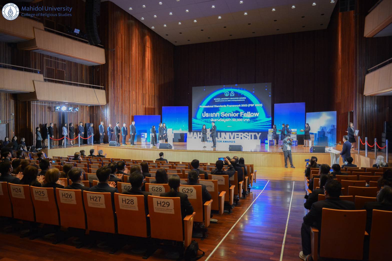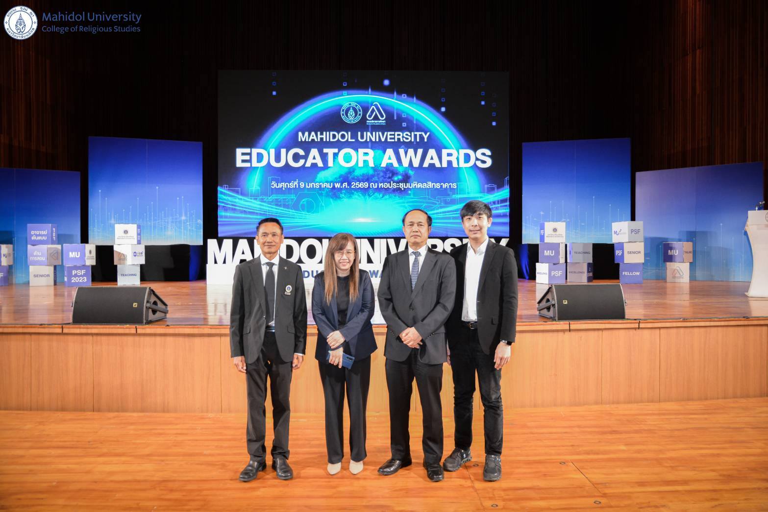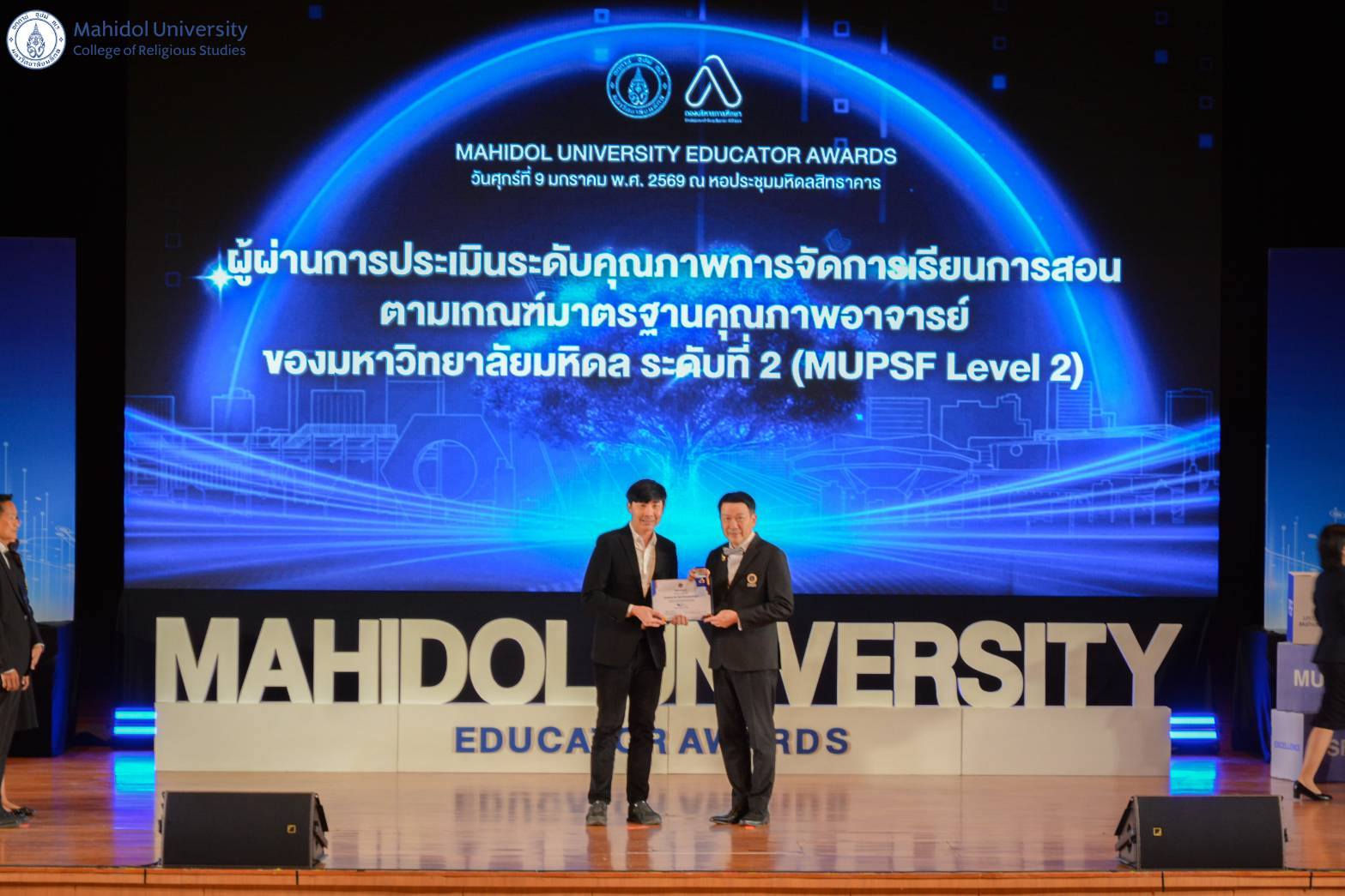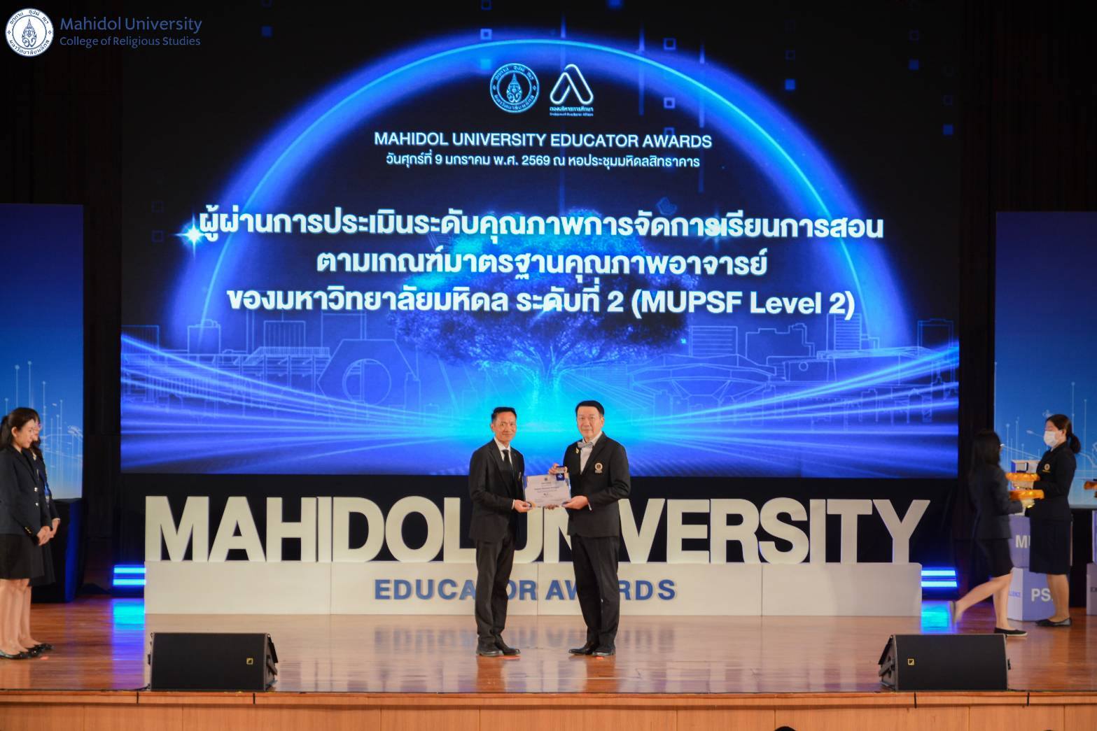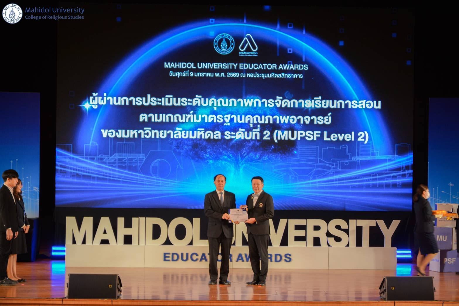 On 9 January 2026, faculty members of the College of Religious Studies, Mahidol University, namely Assistant Professor Dr. Somboon Wattana, Dr. Boonmee Phuangphet, and Dr. Krit Piriyarak, received the MU-PSF Level 2 Teaching Quality Certification at the Mahidol University Educator Awards ceremony, held at the Mahidol Siddhakarn Auditorium, Mahidol University, Salaya.