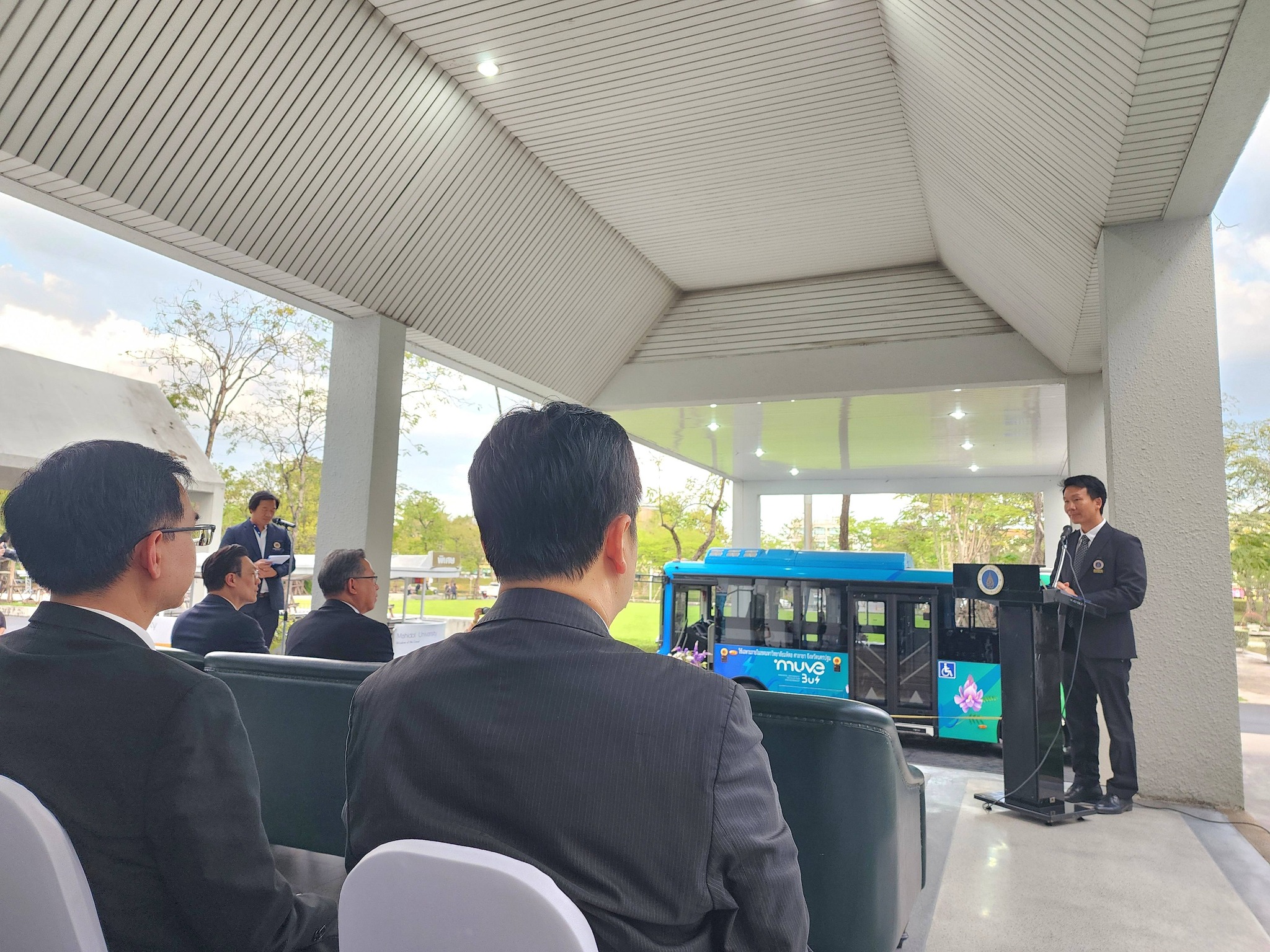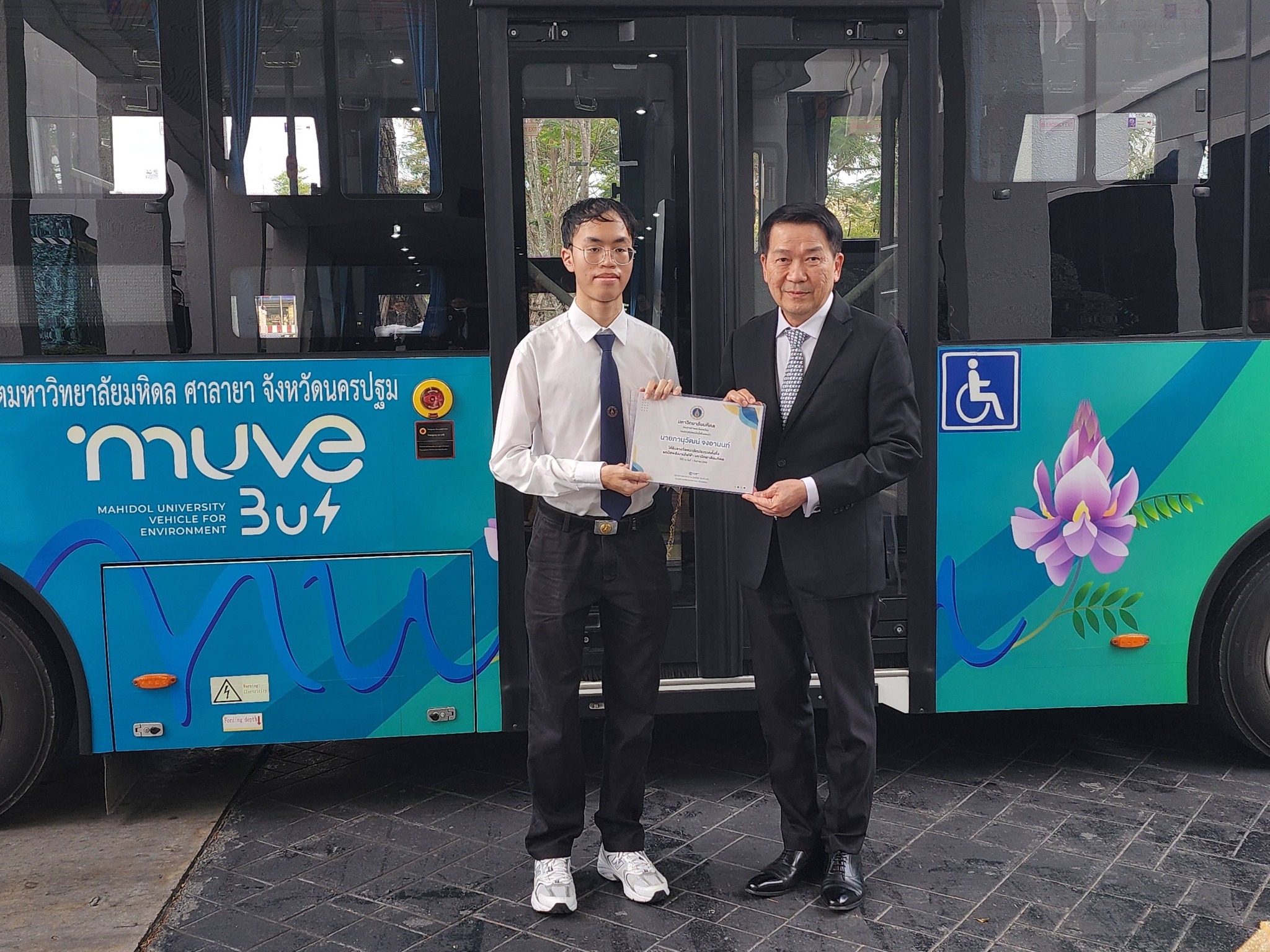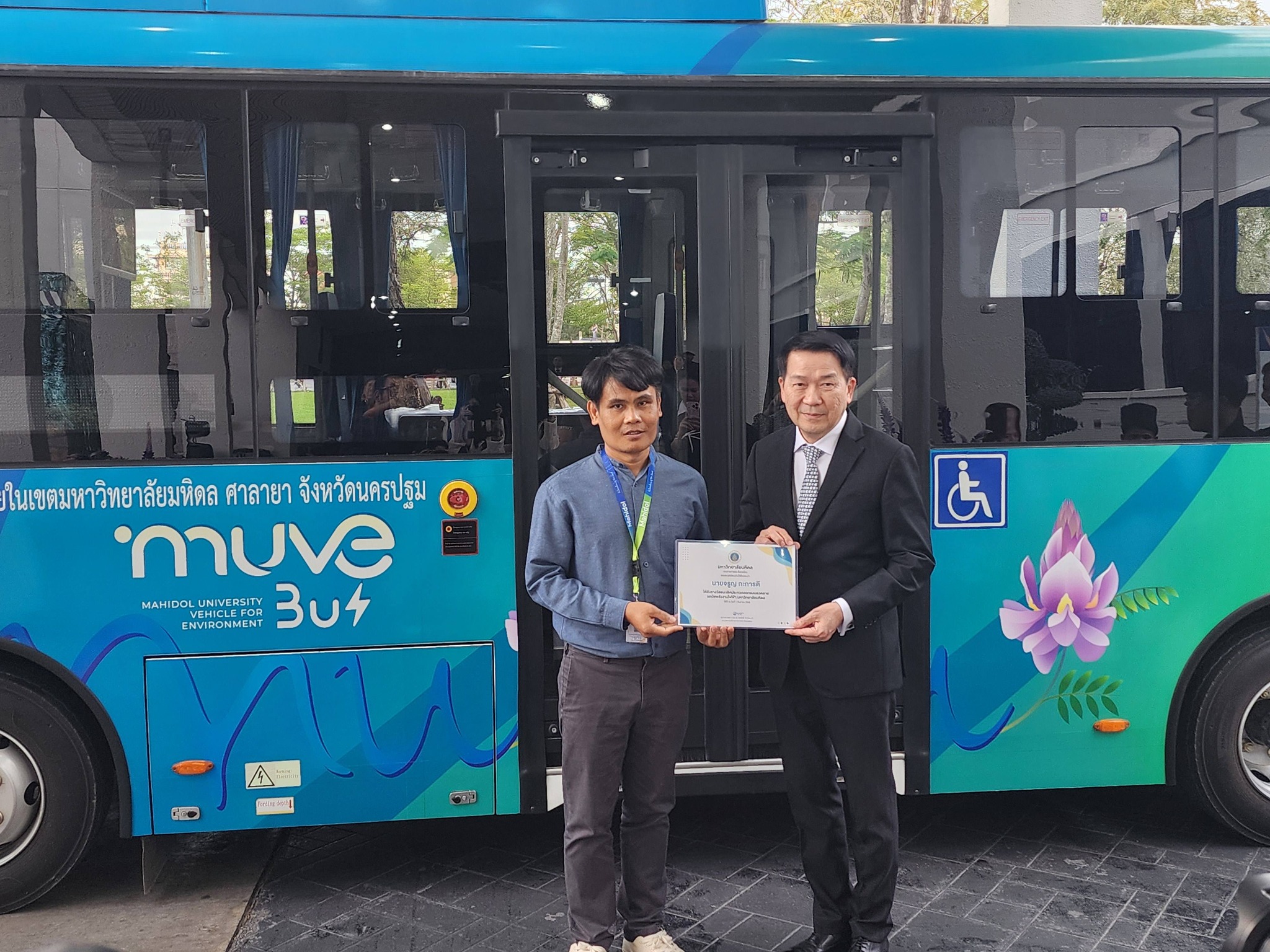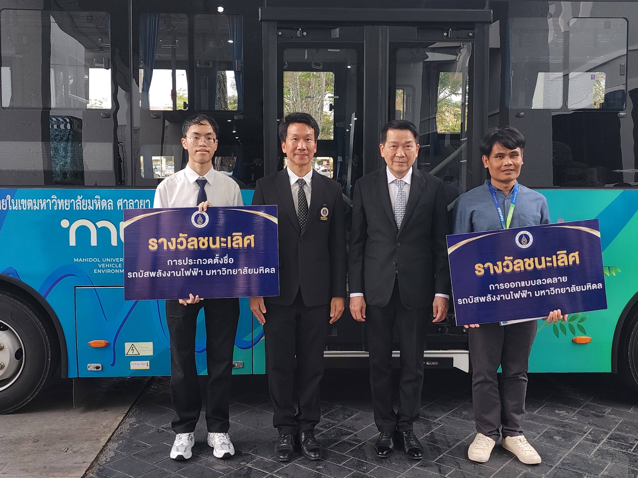 วันที่ 22 ธันวาคม 2568 กองกายภาพและสิ่งแวดล้อม มหาวิทยาลัยมหิดล จัดพิธีเปิดและมอบรางวัลการประกวดตั้งชื่อและออกแบบลวดลายรถบัสพลังงานไฟฟ้าอย่างเป็นทางการ ณ บริเวณหน้าอาคารสำนักงานอธิการบดี โดยได้รับเกียรติจาก ศ.นพ.ปิยะมิตร ศรีธรา อธิการบดีมหาวิทยาลัยมหิดล เป็นประธานในพิธี และ ผศ.ดร.อิทธิโชติ จักรไพวงศ์ รองอธิการบดีฝ่ายกายภาพและสิ่งแวดล้อม เป็นผู้กล่าวรายงานวัตถุประสงค์การจัดงาน