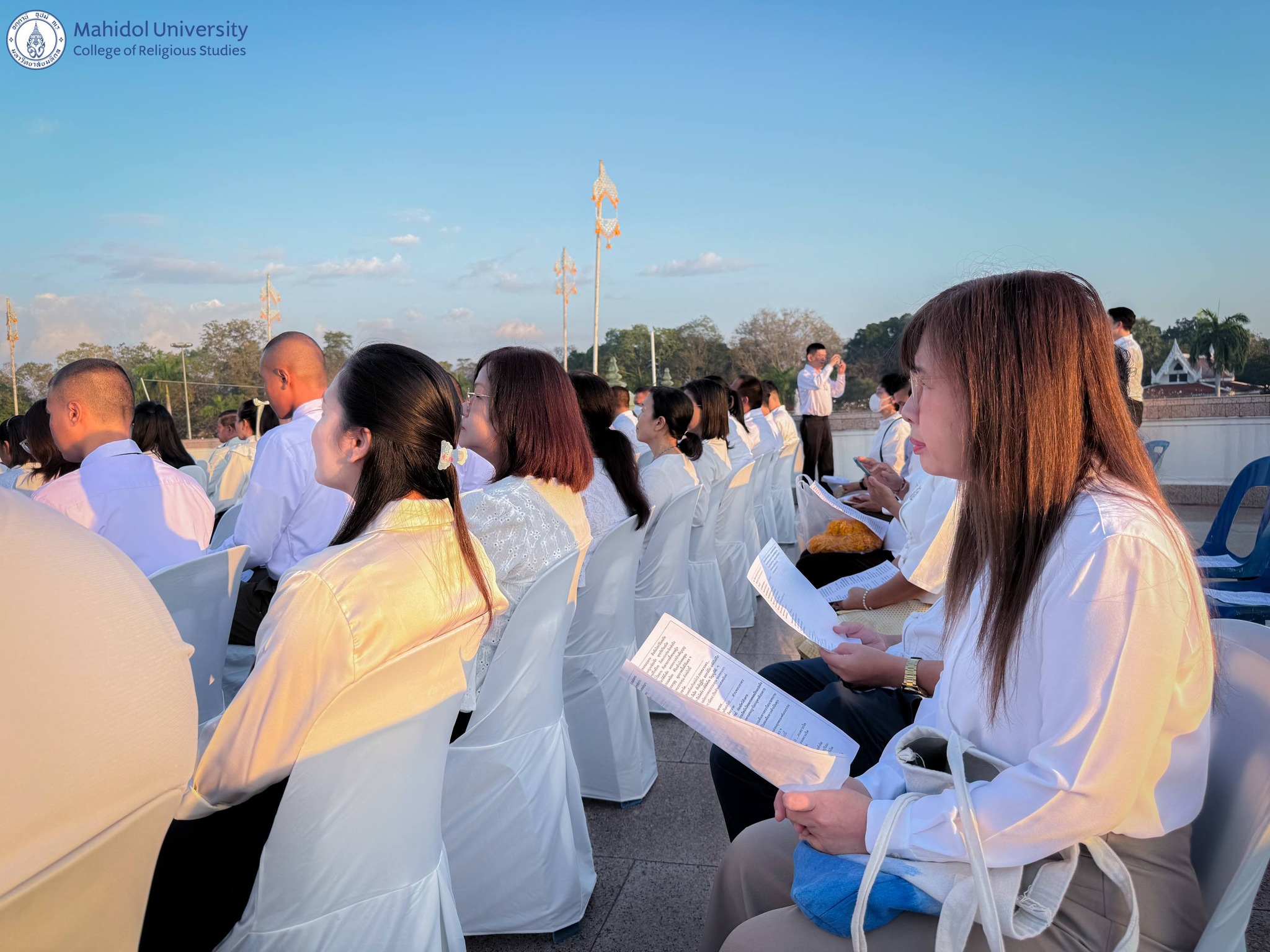 Organized by the National Office of Buddhism, the event aimed to promote Phutthamonthon as a central hub for Buddhist activities. The ceremony commenced at 07:00 hrs. with a worship ceremony paying homage to Phra Sri Sakkaya Thotsaphonlayan at the Presiding Buddha Plaza. This was followed by a Buddhist Mantra Chanting ceremony at the Merit-Making Pavilion (Sala Bamphen Kusol) at 08:30 hrs., during which the Dean also participated in the offering of Thai Dhamma offerings (Sanghathana).