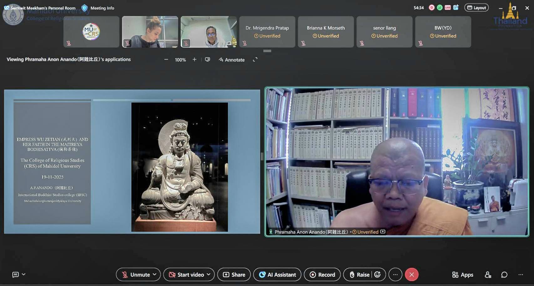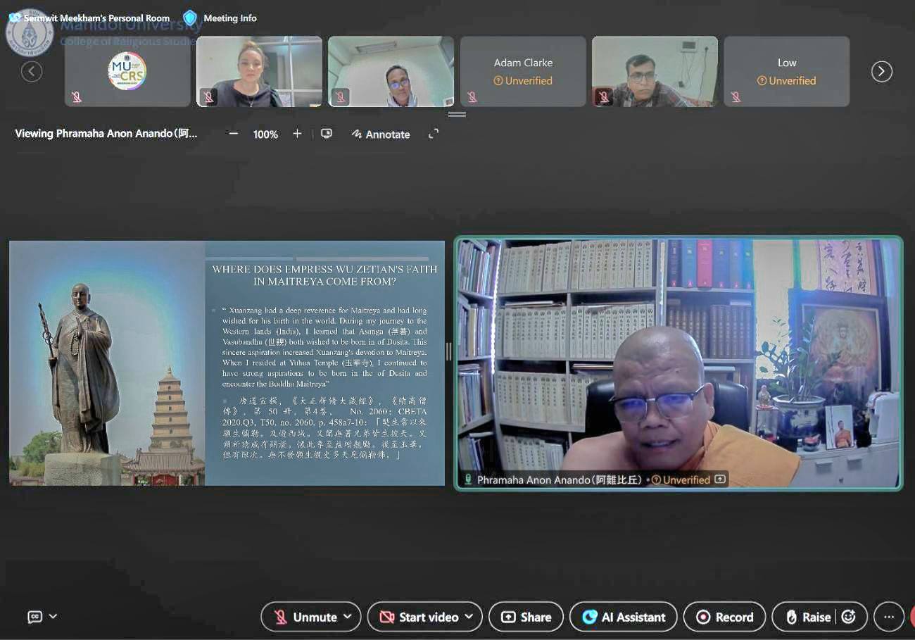 On November 19, 2025 (Wednesday) 14:00 (Thailand Time), the College of Religious Studies, Mahidol University, organized, in collaboration with the Thailand Foundation, an international academic lecture entitled “Empress Wu Zetian and Her Faith in the Maitreya Bodhisattva” as part of the MU-CRS Seminar on Contemporary Religious Studies, conducted online via Webex.