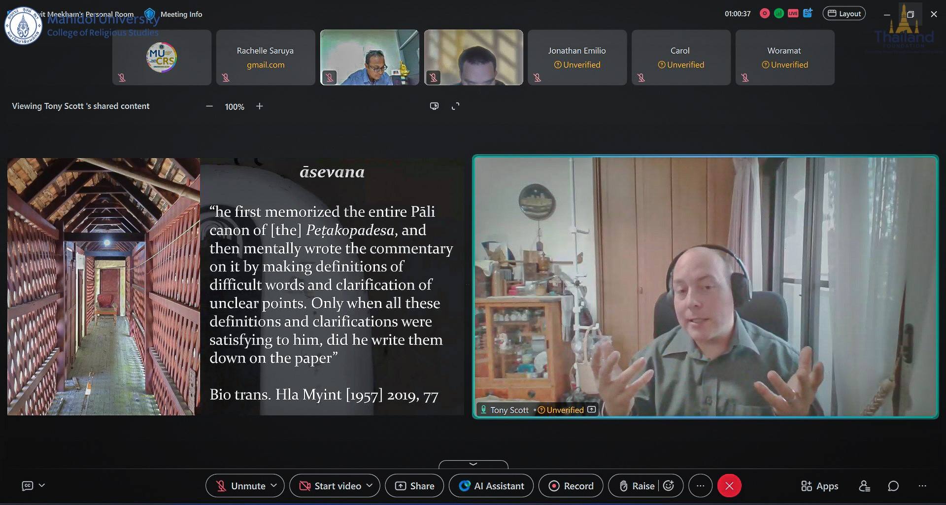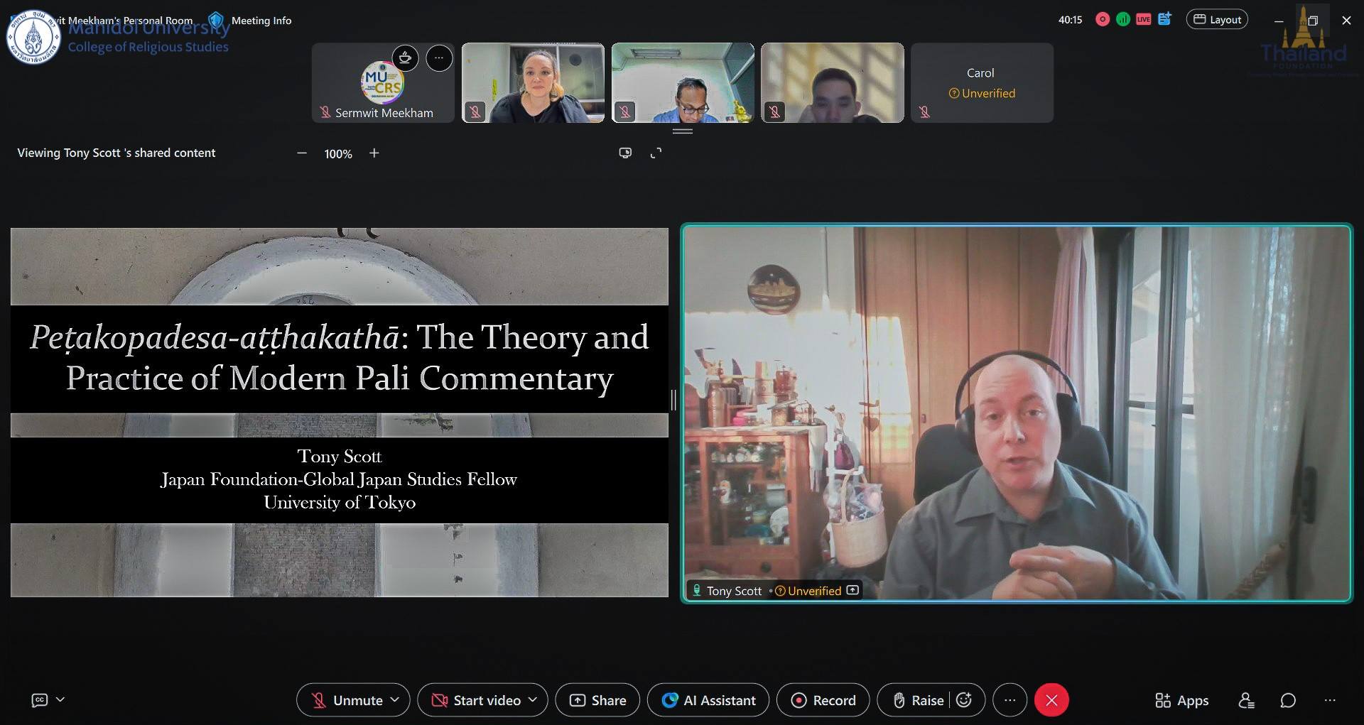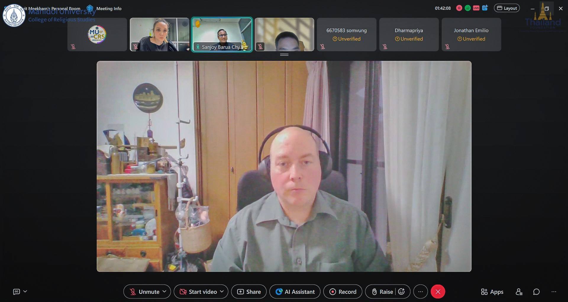 On January 14, 2026 (Wednesday) 14:00 (Thailand Time) the College of Religious Studies, Mahidol University, organized, in collaboration with the Thailand Foundation, an international academic lecture entitled “Peṭakopadesa-aṭṭhakathā: The Theory and Practice of Modern Pali Commentary” as part of the MU-CRS Seminar on Contemporary Religious Studies, conducted online via Webex.