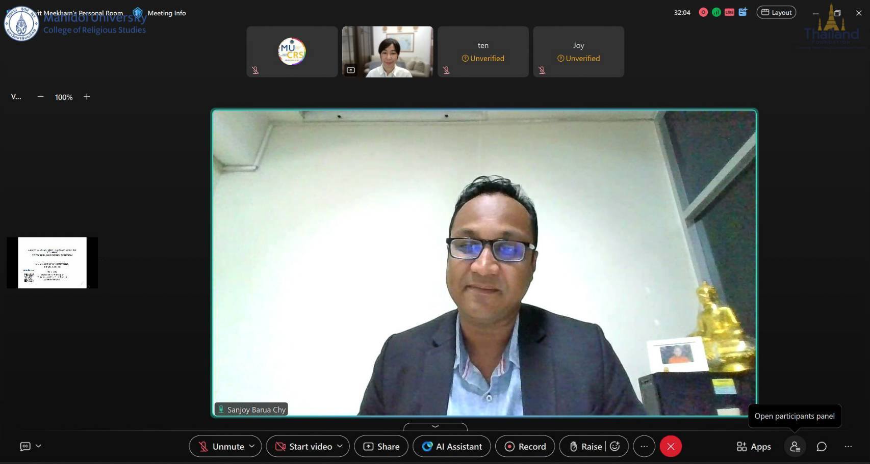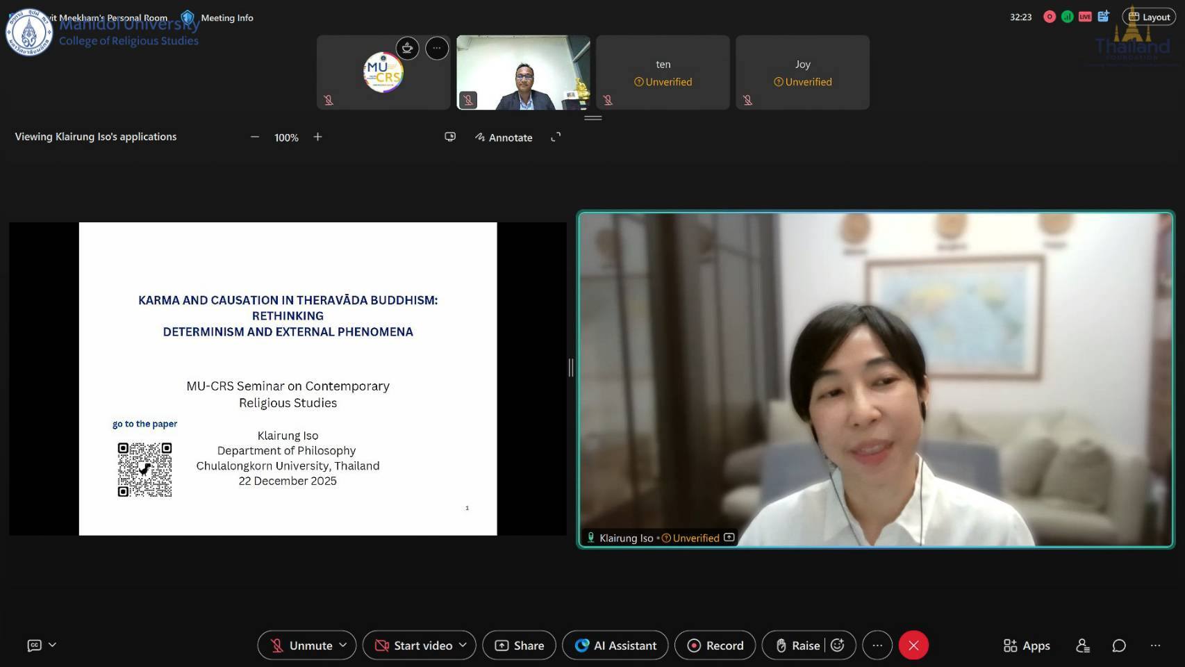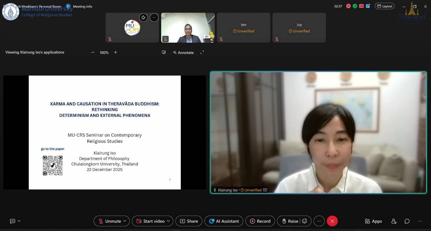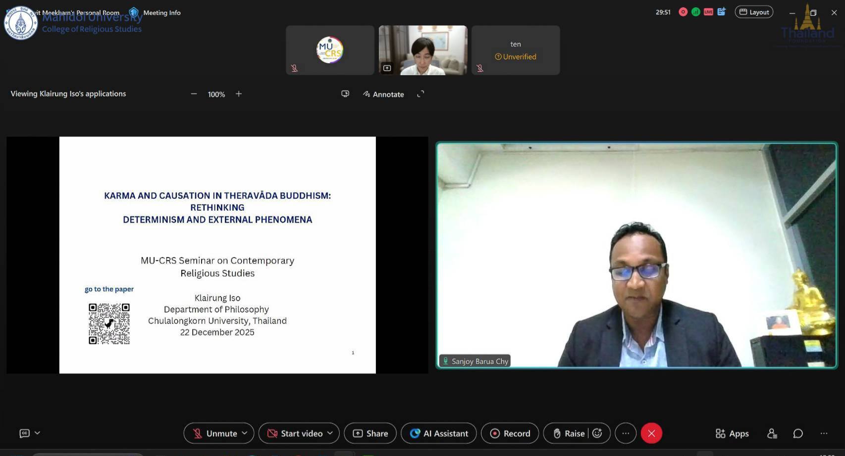 On Monday 22 December 2025 13:00 (Thailand Time), the College of Religious Studies, Mahidol University, organized, in collaboration with the Thailand Foundation, an international academic lecture entitled “KARMA AND CAUSATION IN THERAVĀDA BUDDHISM: RETHINKING DETERMINISM AND EXTERNAL PHENOMENA” as part of the MU-CRS Seminar on Contemporary Religious Studies, conducted online via Webex.